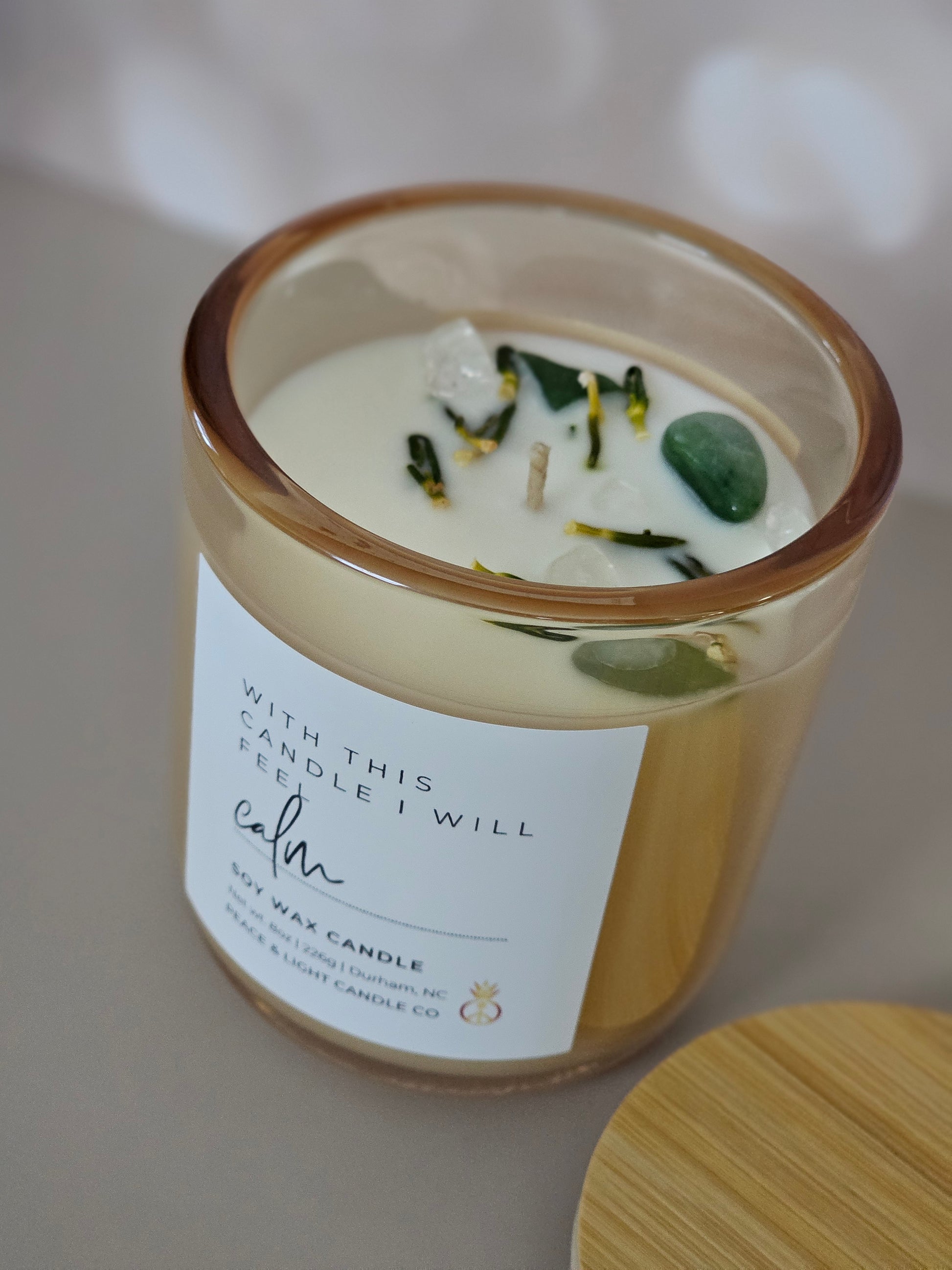 PEACE is a refreshing self-care scent that starts with a calming heart of eucalyptus with base notes of sea salt, and spearmint. Adorned with amethyst, rose quartz, rose buds, lavender.